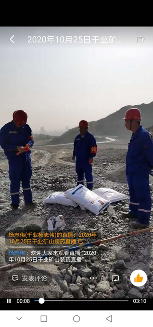 近日,焦作市公安局支隊(duì)領(lǐng)導(dǎo)按照河南省廳民爆未端管控全視頻要求,建立了覆蓋全市可視頻的釘釘群,組織了焦作市轄區(qū)爆破作業(yè)人員本群,對(duì)爆破作業(yè)進(jìn)行全程跟蹤管理。馬村分公司積極響應(yīng)南省民爆末端管控全視頻要求,組織爆破作業(yè)相關(guān)人員進(jìn)入“焦作市爆破作業(yè)管控群”,利用將爆破現(xiàn)場(chǎng)進(jìn)行直播,主要直播人員到位情況(三大員及工程技術(shù)人員是否到位)、卸車、電子雷管入庫(kù)、裝填、起爆等視頻。 在爆破作業(yè)中,首先,現(xiàn)場(chǎng)人員全部到位,包括爆破工程技術(shù)人員1名,爆破員2名,安全員1名,保管員2名,持各自人員名片進(jìn)行報(bào)到。  當(dāng)運(yùn)輸巖石粉狀大包和電子雷管的車到達(dá)作業(yè)地點(diǎn)后,對(duì)數(shù)量進(jìn)行清點(diǎn),卸車。直播開始。  下圖為將電子雷管進(jìn)行入庫(kù)。  下圖為爆破員進(jìn)行裝填直播。 最后,起爆直播。 馬村分公司經(jīng)過(guò)三天釘釘視頻直播的摸索與實(shí)踐,逐步建立起完整可行的直播過(guò)程,且受到市局相關(guān)領(lǐng)導(dǎo)的口頭表?yè)P(yáng)。馬村分公司將會(huì)一直嚴(yán)格按照焦作市局要求,利用釘釘直播,實(shí)現(xiàn)民爆末端管控全視頻要求。 |