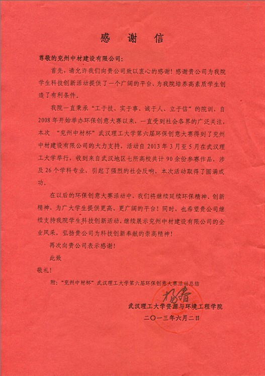 來自武漢理工大學的感謝信