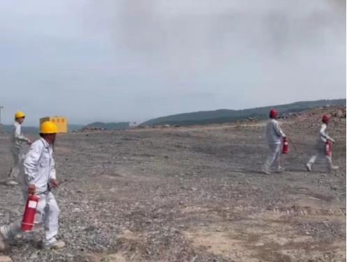此次演練,災(zāi)情設(shè)定挖掘機(jī)在進(jìn)行焊接作業(yè)時,焊接火花飛濺引燃一旁維修時使用的擦拭油料的棉紗,由于維修位置靠近清表時砍伐的樹木且臨近礦區(qū)邊緣林區(qū),由于當(dāng)天風(fēng)勢較大待發(fā)現(xiàn)時被砍伐的樹木已被引燃且火勢洶涌,發(fā)現(xiàn)火災(zāi)事故的員工立即通知帶班領(lǐng)導(dǎo)。帶班領(lǐng)導(dǎo)接到報告后,立即啟動應(yīng)急預(yù)案,組織人員進(jìn)行滅火。